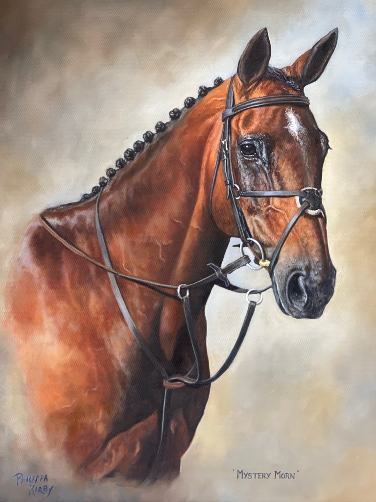 All paintings are created from your own clear photographs, although Philippa is happy to photograph locally or you may bring your animal to her home. She prefers to work from one really good photo that really captures the look and character you wish to achieve (agreed beforehand) but always likes to have a number of others to help and take different elements from if required – a pricked ear, a better shade of coat, a different broadband, bridle, collar, leg stance, shine….artistic licence can be achieved with suggestions by those ordering. She has many times been asked to slim a riders leg!
